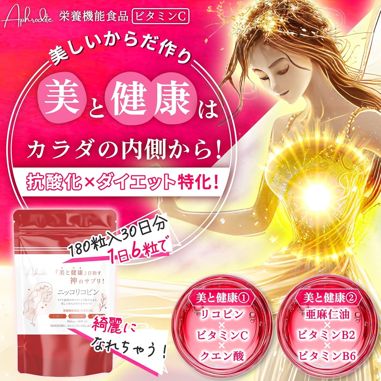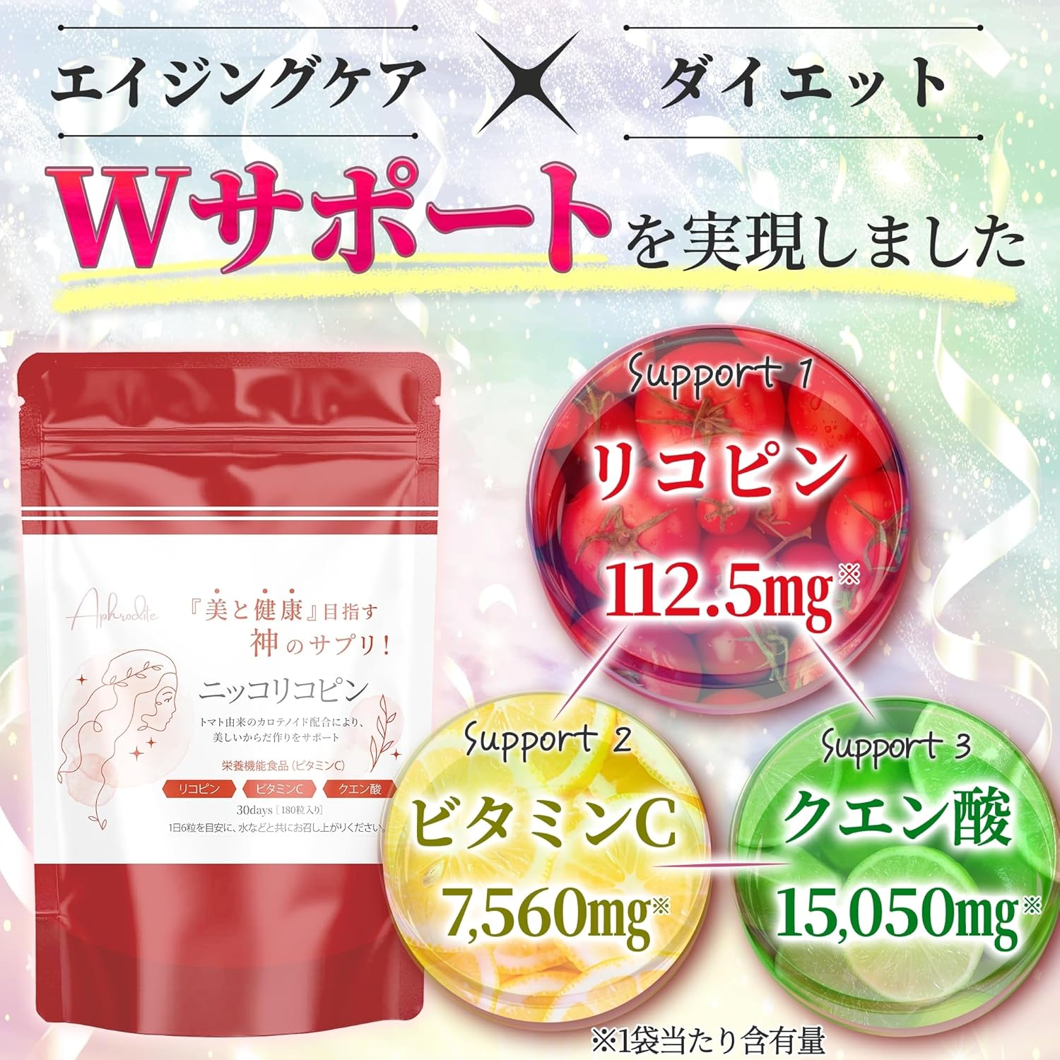 Aphrodite 栄養機能食品 ニッコリコピン 180粒 30日分 リコピン ビタミンC クエン酸 エイジングケア × ダイエットサプリ サプリメント 国内GMP認証工場
